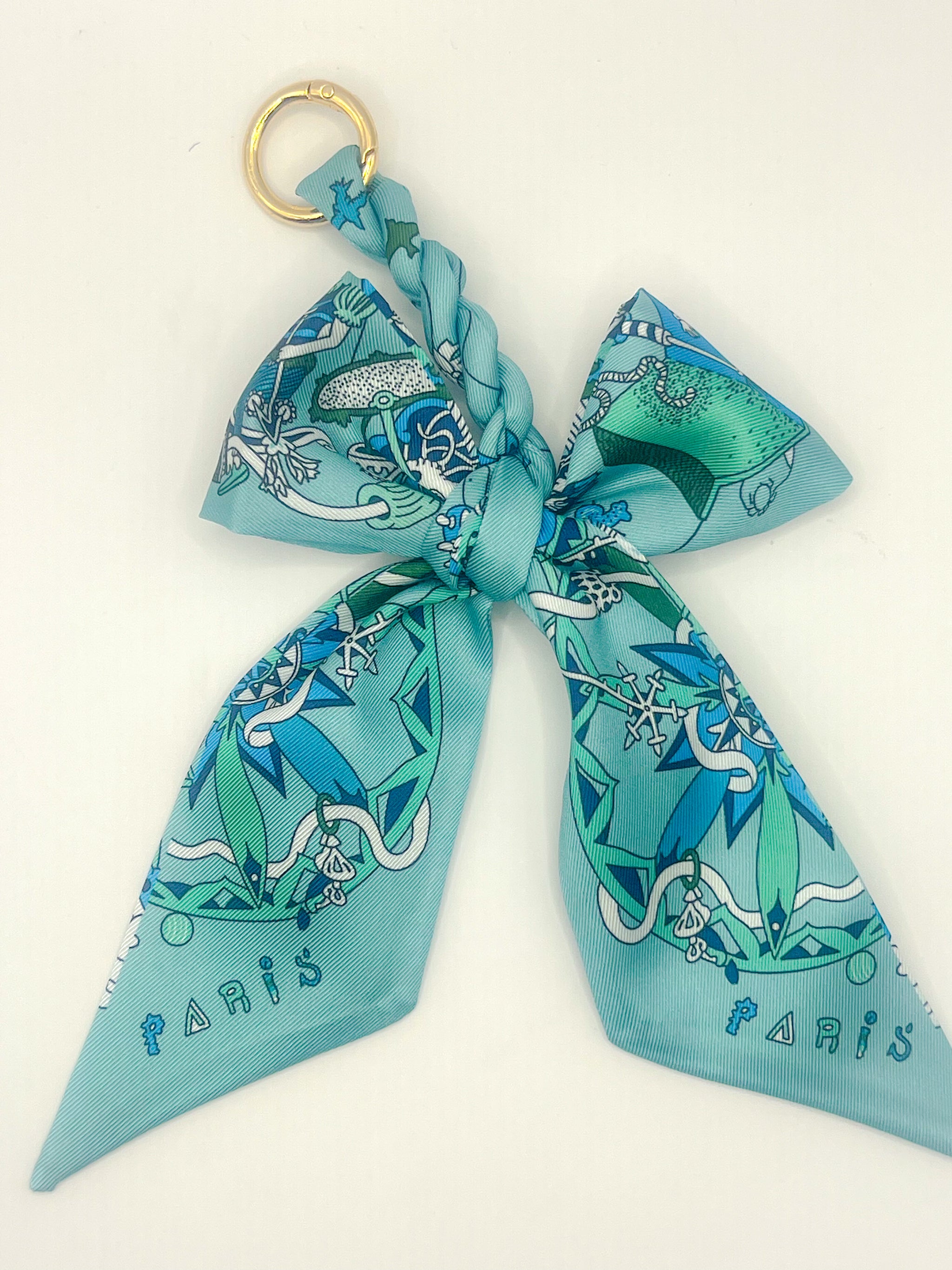 Our Paris Silk Bow Bag Charm is crafted from a silky, jewel-toned ribbon featuring an intricate illustrated map-inspired motif in shades of turquoise, teal, and deep blue. Finished with a polished gold ring clasp, this charm adds effortless sophistication and a touch of French charm to any bag.